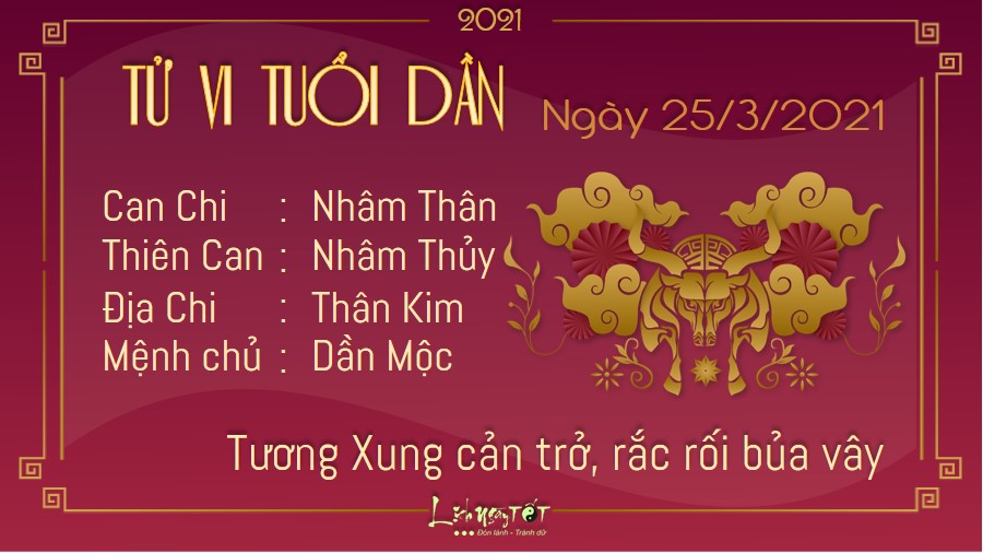 Thân Dần Tương Xung khiến người tuổi Dần sẽ gặp khá nhiều rắc rối trong công việc trong ngày thứ 5 này. Bản mệnh khó kiềm chế được cảm xúc của mình, dễ nổi nóng và gây gổ với bất cứ ai làm không đúng ý mình. Bạn cầu toàn và muốn mọi chuyện được hoàn hảo, điều đó dễ dàng gây ra những khúc mắc khi làm việc nhóm. Rất may là đường tài lộc trong ngày khá sáng, những chú Hổ đón không ít tin vui tiền bạc, khi được Thực Thần nâng đỡ. Người làm ăn kinh doanh dễ có được cơ hội kiếm tiền dễ dàng, chỉ cần bạn nhanh nhạy nắm bắt thời cơ mà thôi. Ngũ hành xung khắc khiến vận trình tình cảm không lý tưởng. Vợ chồng cãi vã, tranh luận về vấn đề nhà cửa, con cái...