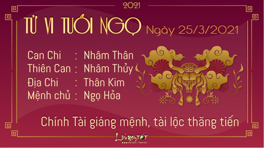 Chính Tài giúp tuổi Ngọ đang có nhiều cơ hội thuận lợi để cải thiện thu nhập hiện tại của mình khi vận trình tài lộc có nhiều bước tăng tiến. Bạn biết kiểm soát chi tiêu của bản thân và đưa ra những kế hoạch quản lý tài chính khoa học. Nhờ vậy, bạn không phải lúc nào cũng lo lắng không có tiền tiêu. Hỏa khắc Kim, chuyện tình cảm của bản mệnh đang có những dấu hiệu của rạn nứt. Tranh cãi bùng nổ từ những vấn đề tưởng chừng quá đỗi nhỏ nhặt, đôi bên chẳng ai chịu ai nên vấn đề cứ thế nảy sinh. Những lời nói lúc nóng giận khiến cho mọi chuyện đi càng ngày càng xa. Thai thần ở hướng Tây Nam phía ngoài nhà kho và phòng bếp, thai phụ không nên lui tới những nơi này tránh làm động Thai thần.