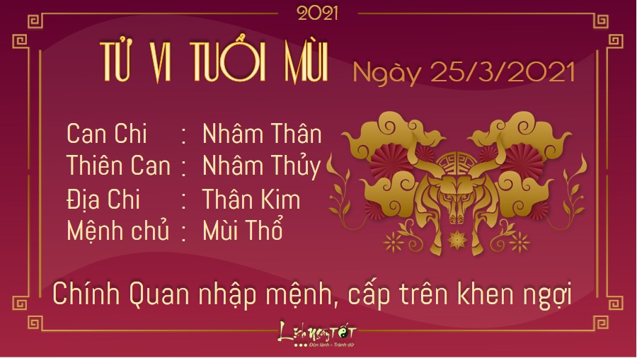 Chính Quan xuất hiện, người tuổi Mùi trong ngày có điềm báo nhiều tin vui sẽ đến trong công việc. Khối lượng công việc có tăng lên khiến bản mệnh trở nên bận rộn nhưng bù lại kết quả tốt, nhận được sự khen ngợi, có khi là cả phần thưởng của cấp trên. Vì vậy, không có lý gì mà không chăm chỉ gắng sức cống hiến cho sự nghiệp. Thổ - Kim tương sinh, chuyện tình cảm bình ổn khiến những chú Dê cảm thấy rất hài lòng. Các cặp vợ chồng không còn tranh cãi và mâu thuẫn thường xuyên nữa, thay vào đó là sự quan tâm và chăm sóc cho nhau. Hôm nay cũng là ngày cát khí lan tràn để người độc thân bày tỏ tình cảm với đối tượng mình thầm mến đã từ lâu.
