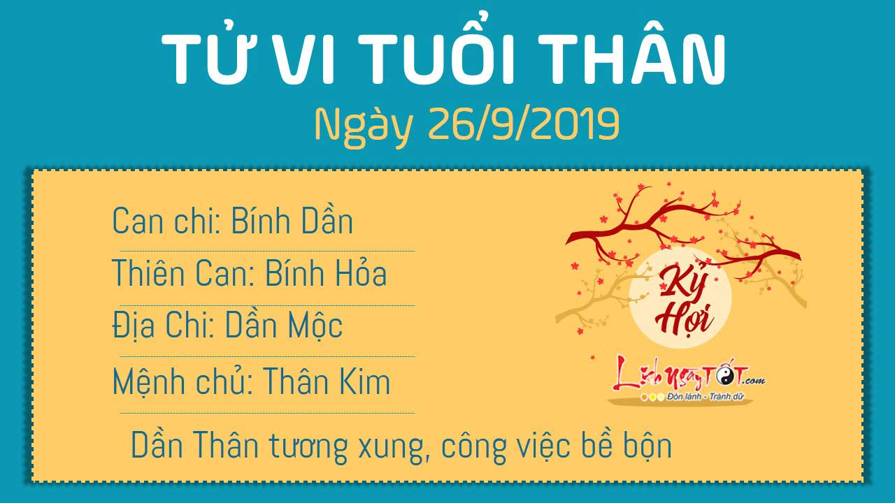 Dần Thân tương xung, người tuổi Thân sẽ phải làm việc rất vất vả vào ngày hôm nay và không nhận được sự giúp đỡ của bất cứ ai. Trong chuyện tình cảm, con giáp này cũng cần phải chú ý đến nửa kia của mình hơn chứ không nên dành quá nhiều thời gian cho sự nghiệp hay bạn bè đàn đúm. Hãy nhanh chóng thay đổi trước khi tình cảm đôi bên nguội lạnh. Hôm nay không thích hợp để xuất hành, nhưng nếu bắt buộc phải đi xa thì bản mệnh nên đi về hướng Tây Nam để gặp Tài Thần hoặc hướng Đông để gặp Hỷ Thần.