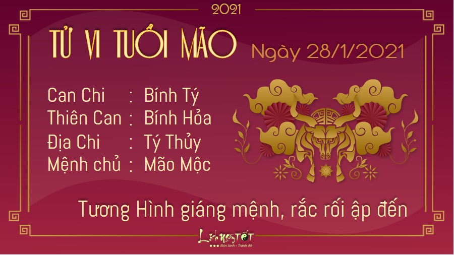 Tuổi Mão khó có một ngày yên ổn do chịu tác động từ cục diện Tý Mão Tương Hình gây ra. Đủ thứ chuyện rắc rối đổ ập đến khiến con giáp này loay hoay. Dù đã rất cố gắng nhưng do thiếu tính nhẫn nại nên bản mệnh phải mất khá nhiều thời gian mới có thể hoàn thành được một công việc cho dù là cơ bản nhất. Hiệu suất trong ngày khó đạt được mức mong muốn, nhất là khi hầu hết các quyết định của bạn đều mang tính chất bốc đồng và thiếu chín chắn. Làm việc gì cũng phải có kế hoạch, điều đó giúp bạn không bị lệch hướng đi của mình. Thủy sinh Mộc cho thấy vận đào hoa của người độc thân có xu hướng tăng nhẹ, nhưng để tạo ra bước đột phá e rằng vẫn cần chờ đợi thêm thời gian nữa.