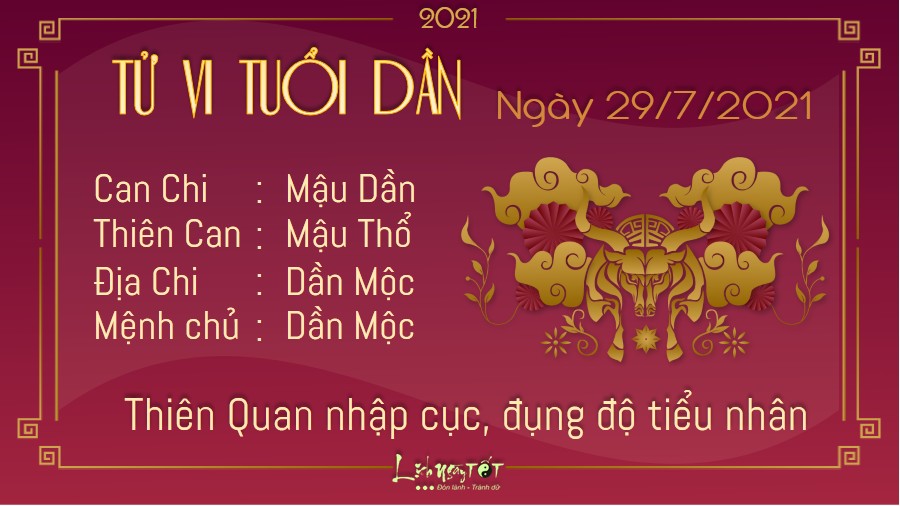 Thiên Quan xuất hiện cho thấy nguy cơ đụng độ tiểu nhân của người tuổi Dần đang khá lớn. Nói mà không suy nghĩ kĩ, con giáp này vô tình đắc tội người khác, khiến cho vận trình sự nghiệp bấp bênh vô cùng. Có nhiều vấn đề tiềm ẩn nguy cơ lớn hơn là bạn tưởng đấy. Ngày này tâm tính bạn dễ bị kích động, ngang ngược nên động đến việc gì cũng dễ sai sót, hỏng chuyện. Vì thế, bạn không nên có những quyết định quan trọng trong ngày hôm nay. Nếu có thể hãy đợi sang một ngày khác có điều kiện thuận lợi hơn. Nhất là những quyết định liên quan đến tài chính, đầu tư càng không nên mạo hiểm. Mộc khí đương vượng cũng gây ra một số vấn đề bất ổn cho sức khỏe con giáp này.