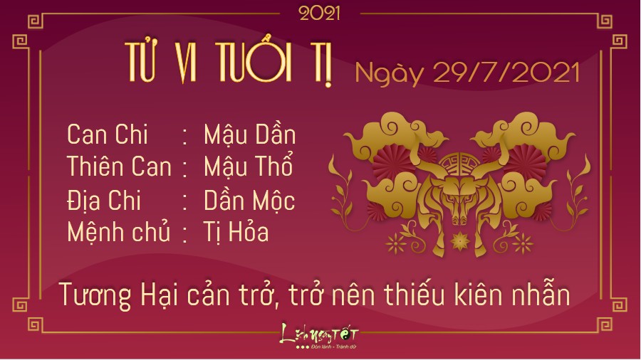 Tương Hại báo hiệu tuổi Tị có thể sẽ gặp phải nhiều rắc rối trong công việc vì tính khí của mình. Hôm nay người tuổi này bỗng trở nên thiếu kiên nhẫn và điềm đạm hơn ngày thường. Bạn có thể nổi nóng với đồng nghiệp chỉ vì những chuyện nhỏ nhặt, khó khăn và khắt khe với những người cùng hợp tác với mình, ảnh hưởng nhiều đến tiến độ công việc. Có những điều vốn có thể du di nhưng tuổi Tị lại quá xét nét, khiến đối phương hậm hực và thế là đôi bên khó tiếp tục làm việc chung. Hung thần này còn khiến chuyện tình cảm có những chuyển biến xấu. Thay vì cùng nhau hướng về tương lai với nhiều dự định xán lạn, hai bạn lại để cho những mâu thuẫn chen chân vào mối quan hệ của mình.