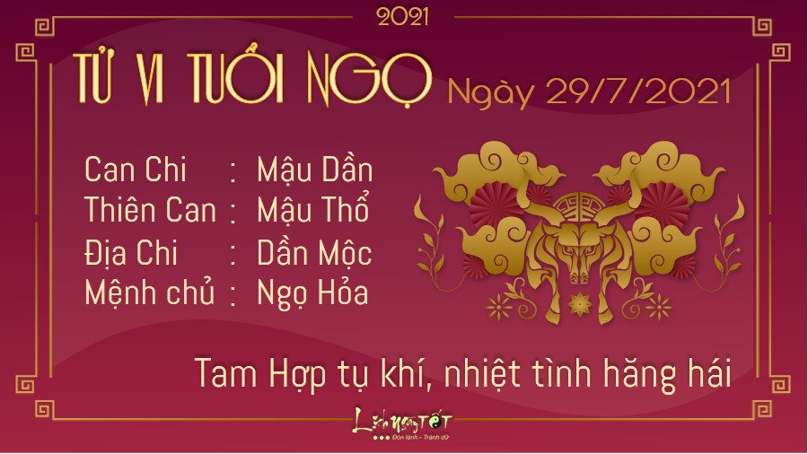 Tam Hợp hậu thuẫn, tuổi Ngọ rất nhiệt tình và hăng hái trong công việc. Bản mệnh bắt tay vào công việc được giao ngay mà không chần chừ, do dự chút nào. Nhờ vậy, bạn tiết kiệm được kha khá thời gian để hoàn thành sớm nhiệm vụ cũng như giúp đỡ người xung quanh. Ngày này, những chú Ngựa cũng có khả năng cao kí kết hợp đồng đã theo đuổi bấy lâu nay. Mộc sinh Hỏa còn giúp mang đến cho bạn nhiều niềm vui, hạnh phúc trong chuyện tình cảm. Nếu ai đang yêu sẽ có ngày trọn vẹn cùng người thương, thậm chí hôm nay cũng là ngày thuận lợi để bàn tính chuyện ra mắt gia đình hai bên. Người độc thân chẳng còn sốt ruột trong việc tìm kiếm một nửa yêu thương mà để mọi chuyện tùy duyên.