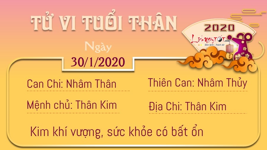 Với người tuổi Thân, dưới sự thúc đẩy của Thiên Ấn, cuối cùng bạn đã dám bước ra khỏi vùng an toàn và dũng cảm thực hiện các kế hoạch mà bản thân đã ấp ủ bấy lâu. Lúc này bạn mới nhận ra, có những việc chỉ khi bắt tay vào làm mới thấy nó không hề khó như mình vẫn nghĩ. Đừng lo rằng bạn sẽ bị đánh giá là người bốc đồng, trái lại, mọi người sẽ ngưỡng mộ sự can đảm và dám nghĩ dám làm của bạn đấy. Ngày hôm nay, Kim khí vượng sẽ ảnh hưởng đến vấn đề hô hấp và có thể gây ra những sự cố bất thường đối với sức khỏe của bạn. Hôm nay, bản mệnh nếu đi đâu nên ưu tiên hướng Hỷ thần là hướng Nam, hoặc hướng Tài thần là hướng Tây.