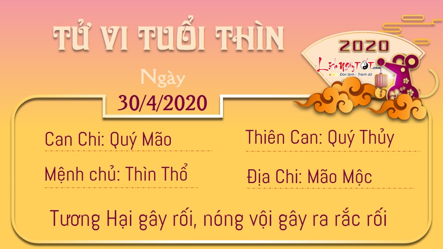 Mão Thìn Tương Hại là nguyên nhân dẫn đến sự nóng vội, thiếu kiên nhẫn của tuổi Thìn trong ngày hôm nay. Đừng để những lời nói bộc phát, thiếu suy nghĩ của mình làm tổn thương người khác. Bù lại, có Chính Quan đưa đường chỉ lối, những chú Rồng có những quyết định khôn ngoan nhờ sự nhạy cảm của bản thân. Có những người không tin vào việc linh tính mách bảo nhưng riêng bạn thì khác. Và lần này bạn đã đúng khi tin tưởng vào lựa chọn của mình. Ngũ hành xung khắc ảnh hưởng phần nào đến chuyện tình cảm của người tuổi này. Hai bạn ngày càng nảy sinh nhiều vấn đề hơn nhưng không biết vấn đề rốt cuộc nằm ở đâu, không ai chịu nhường nhịn ai, chỉ muốn giữ cái tôi của mình.