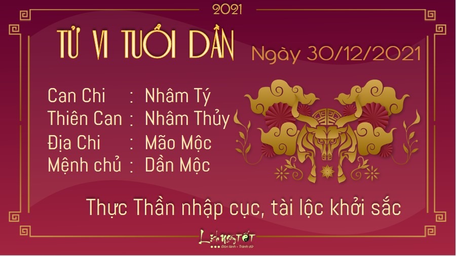 Cát tinh Thực Thần giúp đường tài lộc của tuổi Dần khởi sắc nhanh chóng. Càng về cuối năm, việc làm ăn buôn bán càng thuận lợi hơn nhiều. Bản mệnh dễ dàng tìm thấy được cơ hội kinh doanh khi mà những người xung quanh còn chưa nhận ra. Thời gian này, những chú Hổ có không ít cơ hội nhưng vẫn có thách thức đi kèm trong sự nghiệp của mình. Bản mệnh làm việc nhanh nhẹn, hăng hái và mạnh mẽ nhưng đôi khi lại hơi nóng nảy, để tiểu nhân lợi dụng hạ thấp uy tín của mình. Do đó hãy thận trọng trong từng hành động hơn. Thủy sinh Mộc còn mang tới cho Dần tin vui tình cảm. Con giáp này nếu vẫn còn độc thân sẽ có cơ hội gặp gỡ nửa kia của cuộc đời mình qua những cuộc gặp gỡ bạn bè một cách tình cờ và cũng rất đáng nhớ nữa. Hãy tự tin mở lòng và sống với con người thật của mình, bạn sẽ cảm nhận được tình yêu thương đong đầy của mọi người dành cho mình.
