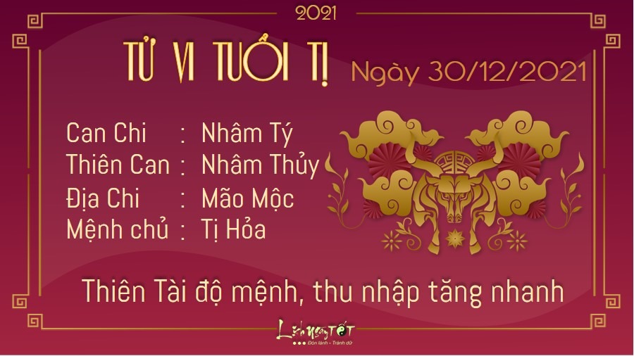 Tuổi Tị có nhiều cơ hội phát tài trong ngày có Thiên Tài che chở. Thu nhập hôm nay có dấu hiệu tăng nhanh. Chỉ cần bạn biết nắm thời cơ và nỗ lực hết mình thì không phải lo nghĩ gì. Kinh doanh buôn bán cứ giữ đà này thì cuối năm bản mệnh sẽ “ấm no” lắm đây. Còn với người làm công ăn lương, những khoản thưởng, hoa hồng hay lợi nhuận liên tục báo về khiến bạn không khỏi mừng vui. Tiếp tục phát huy năng lực trong công việc như những gì bạn đang làm hiện tại, tương lai của bạn sẽ được rạng rỡ hơn nhiều. Tuy nhiên thứ 5 này lại là một ngày khá xung khắc về mặt tình cảm của tuổi Tị khi bạn và nửa kia của mình có những căng thẳng không đáng có, chẳng được vui vẻ như ý muốn. Những mâu thuẫn cứ ngày một gia tăng khiến khoảng thời gian hai người ở bên nhau chỉ thấy mệt mỏi, chán chường. Mọi thứ đang đi ngày càng xa và bạn không biết phải làm thế nào để cứu vãn.