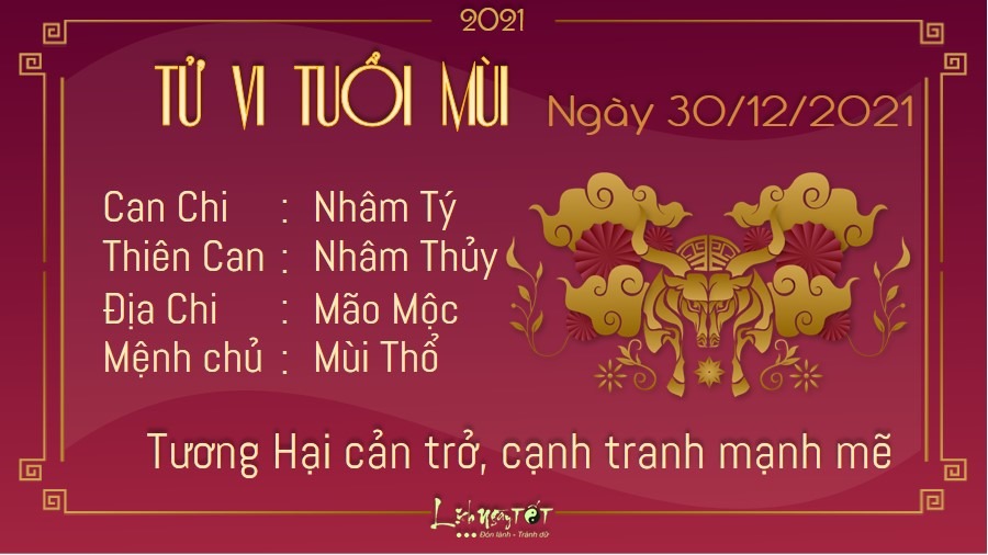 Tuổi Mùi sẽ phải đối mặt với nhiều điều rắc rối trong công việc do những lời đồn thổi, gièm pha sai sự thật. Cục diện Tương Hại khiến đối thủ cạnh tranh tìm mọi cách để hãm hại, tung tin đồn thất thiệt nhằm tạo nên tiếng xấu và ảnh hưởng đến uy tín cá nhân của bạn. Bạn phải thực sự bình tĩnh, giữ cho mình một cái đầu lạnh để xử lý linh hoạt trước mọi tình huống khó khăn. Ảnh hưởng của ngũ hành xung khắc nên chuyện tình cảm đôi lứa cũng nhiều trở ngại khiến con giáp này thấy bất an và vô cùng lo lắng. Giữa hai người xảy ra quá nhiều vấn đề lại thêm tình trạng xa mặt cách lòng, tuy muốn gắn bó với nhau nhưng có thể sẽ gặp phải nhiều trở ngại. Trong khi đó, những người độc thân vẫn khao khát về một mối tình lãng mạn mà bỏ qua thực tế, song tình yêu không phải luôn diễn ra theo cách bạn muốn. Bạn nên sống cởi mở hơn, căn cứ vào tình hình thực tế để sớm tìm thấy hạnh phúc.