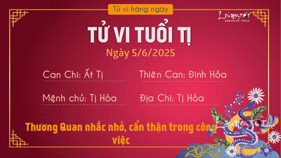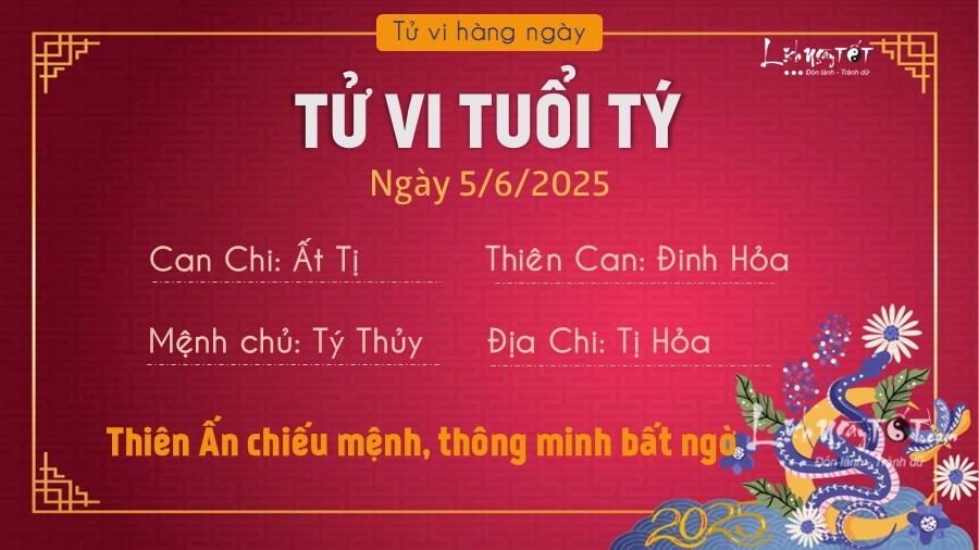 Tiếp nối tử vi ngày 4/6/2025, Thiên ấn chiếu mệnh, Tý thông minh và khôn ngoan trong mọi lĩnh vực, khéo léo xử lý khủng hoảng trong công việc. Ngay cả khi có công việc gấp, bạn cũng không sợ hãi và sẽ giải quyết mọi thử thách một cách có trật tự và suôn sẻ.