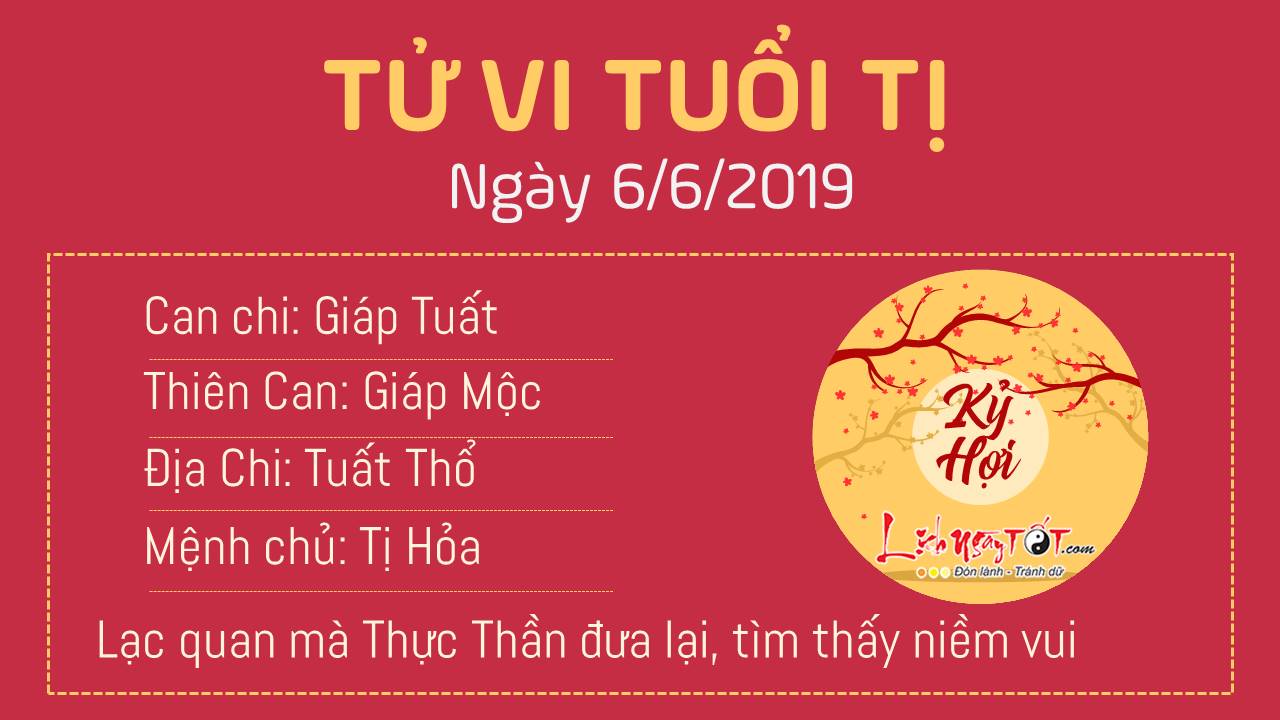 Tinh thần đầy lạc quan mà Thực Thần đưa lại sẽ giúp tuổi Tị tìm thấy niềm vui với bất cứ công việc nào ngày hôm nay. Không những thế, bạn còn cảm nhận được tình cảm của những người xung quanh dành cho mình nữa. Thổ - Hỏa tương sinh cho thấy tình cảm của bản mệnh hôm nay khá thuận lợi, đôi lứa xứng đôi, tâm đầu ý hợp. Thai thần ở hướng Tây Nam phía ngoài cửa phòng thai phụ và tổ chim hoặc lồng chim, không nên dịch chuyển vị trí hoặc tiến hành sửa chữa những đồ vật ở nơi này.