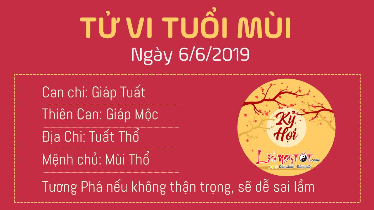 Mùi Tuất Tương Phá, tuổi Mùi nếu không thận trọng, sẽ dễ gây ra những sai lầm trong công việc, và vì thế, nên hết sức chú ý khi đưa ra bất cứ quyết định nào, cũng như khéo léo và thận trọng trong bất cứ giao tiếp nào để tránh sự hiểu nhầm. Con giáp này hôm nay khá may mắn về tiền bạc khi có Chính Tài che chở nhưng bạn nhớ tìm cách cân bằng cuộc sống. Nếu có tiền nhưng bị mọi người xa lánh thì thật đáng buồn. Thổ khí vượng mang lại cho bản mệnh cảm giác bất an.