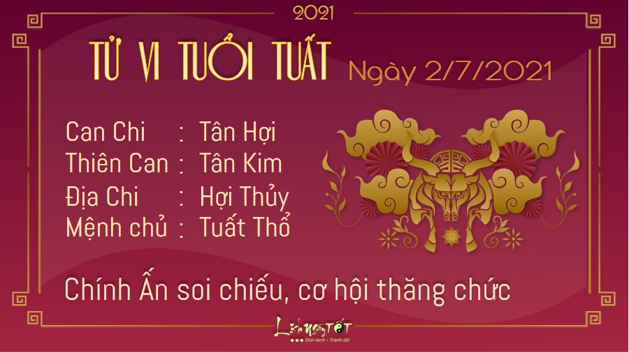 Chính Ấn soi chiếu, người tuổi Tuất có cơ hội thăng quan tiến chức trong ngày hôm nay. Cấp trêm chắc chắn đã nhìn thấy sự chăm chỉ và cẩn thận của bạn và sẵn sàng trao cho bạn nhiều cơ hội để thể hiện bản thân. Khi đứng trước những cơ hội như vậy, bạn hãy tự tin nắm bắt, đừng chần chừ, do dự, lo rằng mình không đủ khả năng. Bạn là người rất có tiềm năng và chẳng hề thua kém bất cứ ai, vì vậy đặt ra những đích đến tham vọng hơn. Thổ khắc Thủy khuyên con giáp này cần phải quan tâm và dành nhiều thời gian hơn nữa cho con cái của mình, nhất là khi con còn nhỏ. Đừng để đến khi mối quan hệ của mình và các con trở nên xa cách mới cảm thấy hối hận.