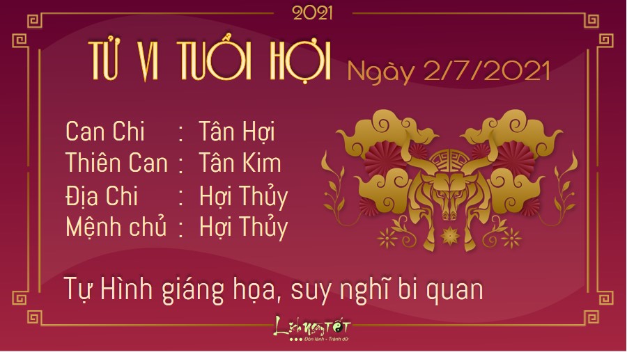Tự Hình ảnh hưởng đến cảm xúc của tuổi Hợi, khiến bạn dễ có những tư tưởng bi quan. Bản mệnh nên học cách đối diện với những điều không mong muốn, đừng tìm cách lảng tráng hoặc đổ lỗi cho người khác. Thời điểm này, bạn nên hạn chế sự nóng vội, đưa ra những quyết định không chính xác. Bạn nên dành thời gian nhìn nhận lại mọi việc và tự kiểm điểm xem đó có phải là nguyên nhân khiến mình khó gặt hái được thành công hơn người khác không. Nếu có kế hoạch xuất hành trong ngày hôm nay, bản mệnh nên đi về hướng Tây Nam để gặp Hỷ thần hoặc Tài Thần. Đây là hướng tốt nhất trong ngày, đem lại nhiều may mắn, giúp công việc của bạn gặp được nhiều điều thuận lợi.