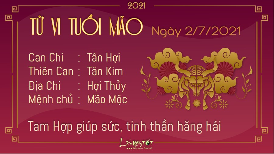 Tam Hợp tác động khiến tuổi Mão luôn cảm thấy hăng hái và nhiệt tình khi bắt đầu một ngày mới. Bạn không ngại nhận thêm trách nhiệm cấp trên giao phó, cho dù hôm nay đã gần sát cuối tuần đi chăng nữa. Các mối quan hệ xã giao của bạn phát triển tốt đẹp, không ít người muốn giới thiệu cho bạn những cơ hội triển vọng. Điều bạn nên làm trong khoảng thời gian tới là xác định một hướng đi đúng đắn phù hợp với năng lực của mình. Thủy sinh Mộc cho thấy bản mệnh được sống trong một gia đình có bầu không khí rất yên bình và ấm áp. Quan hệ giữa hai vợ chồng hài hòa, bạn và nửa kia của mình luôn thẳng thắn mọi chuyện với nhau, cùng nhau lo lắng những vấn đề xảy đến trong cuộc sống.