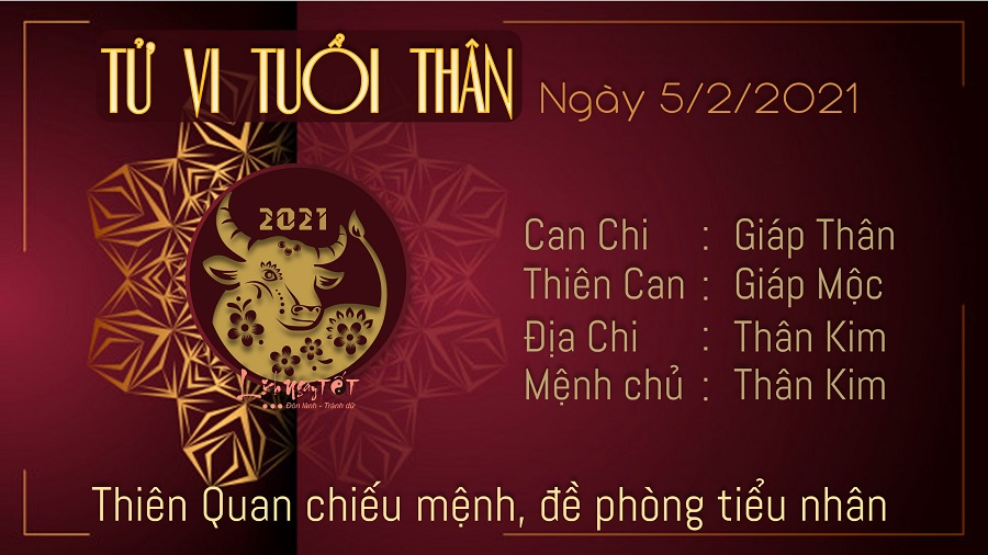 Thiên Quan chiếu mệnh, người tuổi Thân cần chuẩn bị sẵn sàng tinh thần đối diện với kẻ tiểu nhân. Dù có bắt tay vào công việc quen thuộc thế nào đi nữa, bạn cũng chớ lơ là. Cùng với đó, khi đối diện với sự nghi ngờ, gièm pha của người ngoài, bạn chớ nên nóng nảy, kích động, bởi càng như vậy thì bạn càng dễ phạm sai lầm. Hãy tiếp tục làm tốt công việc của mình và để thực tế chứng minh. Kim khí vượng, bản mệnh cần quan tâm hơn đến sức khỏe, đặc biệt là các bệnh liên quan đến xương cốt. Người lớn tuổi chú ý không làm việc quá sức, còn người trẻ tuổi làm văn phòng chớ nên ngồi một chỗ quá lâu.