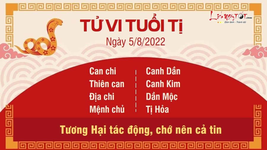 Người tuổi Tị phải chịu nhiều tác động xấu do cục diện Tương Hại mang lại. Ngày hôm nay, bạn tốt nhất không nên cả tin kẻo rơi vào bẫy của kẻ tiểu nhân. Hãy tập trung vào công việc để hạn chế những sai sót không đáng có. Với người làm kinh doanh, đối thủ cũng tìm cách chơi xấu để bạn phải chịu thiệt hại về danh tiếng hoặc tiền bạc. Con giáp này cần tỉnh táo để phân biệt ai là người đáng tin cậy, đâu là nguy cơ tiềm ẩn, không nên chạy theo xu thế thị trường. Ngày 8 âm lịch nhân thần ở phía trong ở phía trong cổ tay, phía trong đùi và âm hộ. Tránh mọi sự tổn thương, va chạm, mổ xẻ, châm chích tại vị trí này.