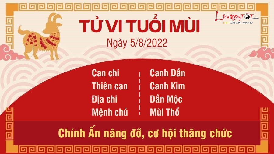 Chính Ấn nâng đỡ, người tuổi Mùi có một ngày làm việc thuận lợi. Thậm chí, có người còn được chạm tay vào cơ hội thăng chức, tăng lương. Có thể thấy rằng những gì bạn bỏ ra trong thời gian qua đã được đền đáp xứng đáng. Với người làm lãnh đạo, hãy quan tâm hơn đến tiếng nói của nhân viên cấp dưới, có thể nhờ đó mà bạn sẽ tìm ra hướng mới giải quyết vấn đề. Đừng giữ mãi những suy nghĩ bảo thủ, đã đi vào lối mòn nhé. Thổ sinh Kim, trong gia đình, con giáp này và nửa kia luôn duy trì tình cảm rất ổn định, đó là do đôi bên thường hay chia sẻ những suy nghĩ của mình với nhau. Dù là trong quyết định lớn hay nhỏ, hai người vẫn luôn bàn bạc và trao đổi.