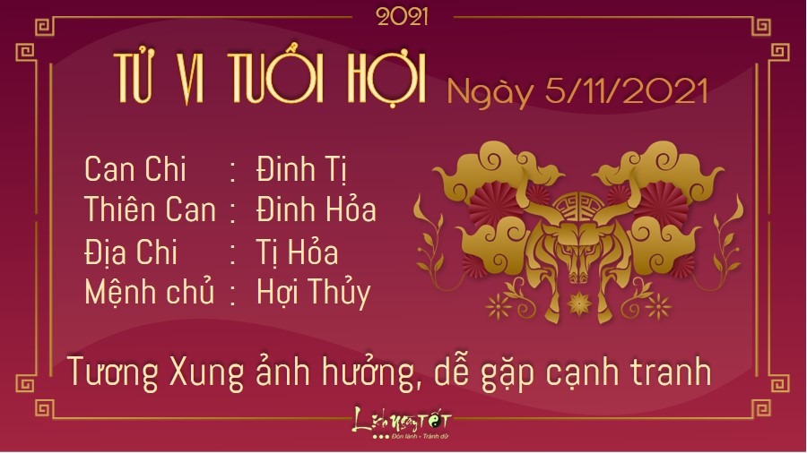 Tuổi Hợi ôm những tham vọng rất lớn nhưng lại phải chịu ảnh hưởng của cục diện Tương Xung. Bạn phải chịu sự canh tranh khốc liệt của đồng nghiệp hoặc đối thủ, khiến công việc chẳng tiến triển thuận lợi như kì vọng. Cạnh tranh có thể khiến bạn thấy mệt mỏi, nản chí, song bạn không nên vì thế mà suy nghĩ đến chuyện từ bỏ, nhường cơ hội vào tay người khác. Nghĩ trên phương diện tích cực, bạn sẽ phát triển nhanh chóng hơn nếu gặp được đối thủ xứng tầm. Kim sinh Thủy, người ấy luôn tin tưởng và ủng hộ mọi quyết định của bạn. Hãy coi tình cảm của người ấy là động lực để tiếp tục vươn lên. Nếu gặp khó khăn gì, bạn cũng hay tâm sự với đối phương để hai người cùng tìm cách tháo gỡ.