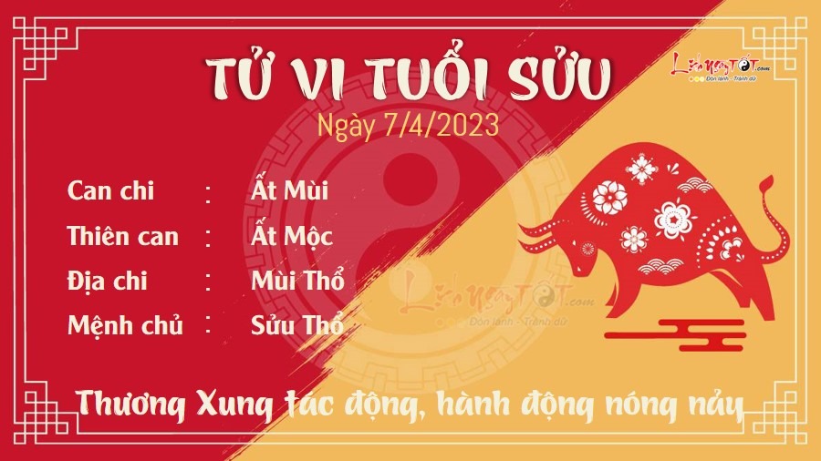Tương Xung tác động, người tuổi Sửu bỗng trở nên nóng nảy và bốc đồng hơn hẳn thường ngày. Bản mệnh thường thích làm mọi việc theo ý mình mà không cân nhắc kĩ, đồng thời thích áp đặt cho người khác. Có lẽ bạn dành thêm thời gian để nhìn lại bản thân và những gì mình đã làm. Bạn vốn không thể luôn là người đúng trong mọi việc, vì thế việc lắng nghe và học hỏi mọi người xung quanh là rất cần thiết, như vậy mới có thể tiến bộ được. Chuyện tình cảm cũng không khá khẩm hơn. Con giáp này có thể đã lỡ nặng lời trong lúc tức giận vì không thể nào chịu đựng được sự ghen tuông vô lý của người ấy. Xem ra đôi bên đều cần thời gian để bình tĩnh lại và suy nghĩ về những gì đã qua.
