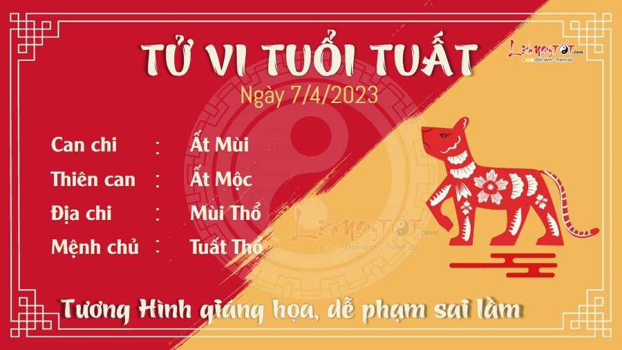 Tương Hình giáng họa, người tuổi Tuất đừng để sự chủ quan trong công việc khiến mình mắc phải những sai lầm đáng tiếc. Hãy cố gắng thay đổi góc độ quan sát vấn đề, bạn sẽ thoát khỏi ngõ cụt và tìm ra hướng đi mới cho mình. Với người làm ăn kinh doanh, những quyết định vội vàng sẽ khiến bạn không nhận ra cái bẫy mà kẻ xấu đã giăng sẵn. Hôm nay, tốt nhất bạn nên tiếp tục với những công việc còn dang dở, việc đầu tư nên bình tĩnh chờ thời điểm thích hợp hơn. Trong mối quan hệ vợ chồng, có vẻ như bạn đang quá đề cao suy nghĩ cá nhân mà bỏ ngoài tai lời người ấy. Điều đó khiến cho mối quan hệ đôi bên dễ lâm vào trục trặc. Bạn cần sửa tật xấu của mình trước khi nửa kia cảm thấy mệt mỏi.