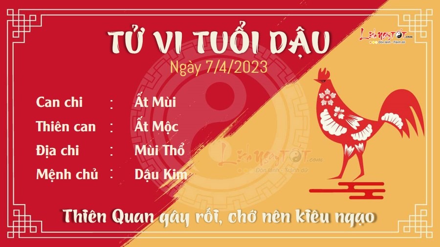 Thiên Quan đem tới tác động xấu, khiến cho người tuổi Dậu trở nên kiêu ngạo hoặc tỏ ra bất mãn với mọi người xung quanh. Dù có vừa gặt hái được thành tích tốt đi nữa, bản mệnh cũng nên khiêm tốn thì mới được yêu mến. Người làm lãnh đạo cũng nên xem lại cách thức làm việc của mình. Bạn không nên độc đoán và áp đặt cấp dưới phải nghe theo ý kiến của mình. Chỉ khi mỗi người đều được nêu ý kiến, tập thể mới có thể phát triển nhanh chóng được. Thổ sinh Kim, may mắn nửa kia của bạn là người luôn biết cách lắng nghe và thấu hiểu. Vì thế, nếu có khúc mắc gì, hãy tâm sự với người ấy để cảm thấy nhẹ nhõm hơn. Đối phương có thể cũng sẽ đưa ra cho bạn những lời gợi ý hữu ích.