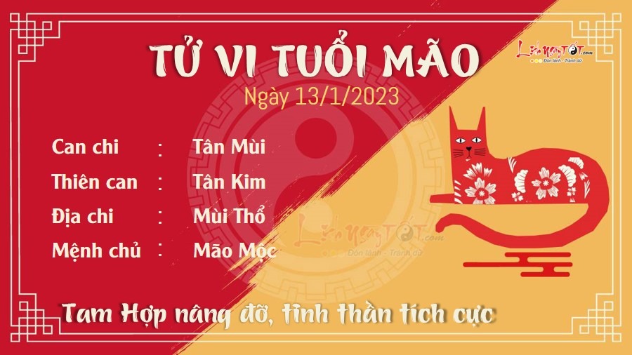 Tam Hợp nâng đỡ, người tuổi Mão duy trì được trạng thái tinh thần tích cực, lạc quan trong ngày hôm nay. Cũng nhờ vậy, bản mệnh đi đến đâu cũng được mọi người yêu mến, thậm chí được quý nhân giới thiệu cho cơ hội tốt hiếm có. Trong công việc, bạn cũng tiến bộ vô cùng nhanh chóng bởi bạn luôn chú ý khiêm tốn, học hỏi, lắng nghe mọi người xung quanh. Khi được giao cho công việc khó, bạn cũng không ngại ngần chấp nhận để rèn luyện và khẳng định bản thân. Mộc khắc Thổ mang lại những ảnh hưởng không tốt đến mối quan hệ giữa bạn và người ấy. Cả hai đều cần phải hạ cái tôi của mình xuống. Hãy hiểu rằng mọi chuyện đều có thể giải quyết nếu như đôi bên không cố tình căng thẳng hóa mọi việc.