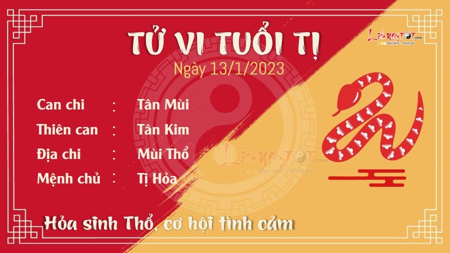 Hỏa sinh Thổ, nếu đã phải lòng ai, người tuổi Tị nên nhanh chóng bày tỏ tình cảm của mình với người ấy. Hành động dứt khoát và chân thành của bạn sẽ khiến cho đối phương cảm động, thậm chí là chấp nhận lời yêu của bạn. Trong gia đình, con giáp này cũng dễ nhận được sự cảm thông của những người lớn tuổi trong gia đình. Mỗi khi gặp vấn đề trong cuộc sống, bạn có thể lựa chọn tâm sự với họ, mọi người có thể đưa cho bạn những lời động viên và định hướng phù hợp. Chính Quan phù trợ, bản mệnh dễ thực hiện được mong muốn mình đã đặt ra từ lâu của mình và khiến mọi người xung quanh đều phải ngạc nhiên. Ngoài ra, hôm nay cũng là một ngày thuận lợi để bạn kí kết hợp đồng làm ăn.