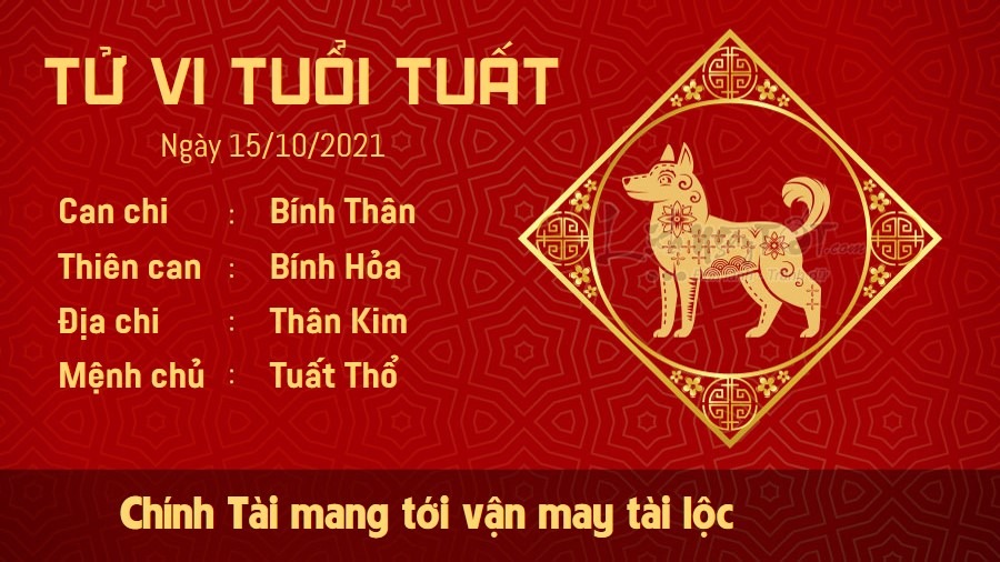 Chính Tài cho thấy người tuổi Tuất có vận may tài lộc trong ngày hôm nay. Bạn có thể được thừa hưởng số tài sản mà những người đi trước để lại. Bạn cần tìm cách sử dụng số tiền đó sao cho hợp lý, chớ nên nghĩ đến việc chơi bời hưởng thụ. Có thể thấy rằng bạn là người có tài năng, vì vậy đừng nên lãng phí tài năng của mình. Hãy sẵn sàng thử sức trong những công việc mới, đừng vội hài lòng với những gì đã quá quen thuộc, bạn còn có thể tiến xa hơn hiện tại rất nhiều. Trên phương diện tình cảm, Thổ sinh Kim cho thấy người tuổi này rất vượng đào hoa. Nếu đã phải lòng một ai đó, bạn nên dũng cảm bày tỏ để có thể mở ra một cơ hội triển vọng cho đôi bên.