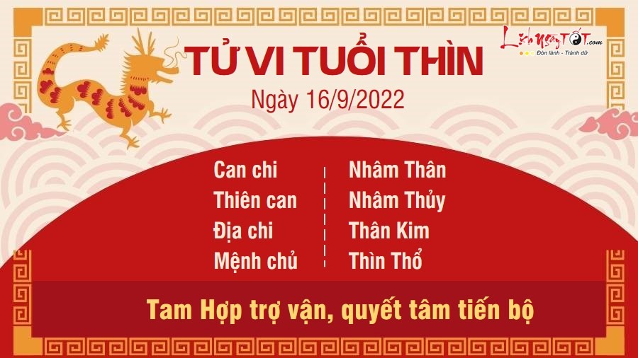 Người tuổi Thìn được Tam Hợp trợ vận, chính vì thế mà bạn trở nên độc lập và chẳng muốn phụ thuộc vào bất cứ ai, cho dù người ta có chủ động tỏ ý muốn giúp đỡ bạn đi nữa. Bạn muốn tự rèn luyện để tiến bộ hơn mỗi ngày. Trước khi thực hiện công việc gì, bạn có khả năng phân biệt lợi hại và đúng sai, chính vì vậy mà những quyết định bạn đưa ra trong ngày hôm nay đều khá đúng đắn. Tuy nhiên, đừng có quá kiêu ngạo và tự mãn, coi thường ý kiến của mọi người đấy nhé. Thổ sinh Kim, hôm nay là ngày khá may mắn trên phương diện tình cảm của bạn. Vì thế, nếu đã phải lòng ai, hãy mạnh dạn tiếp cận người đó. Có thể đối phương cũng đã có thiện cảm với bạn từ lâu rồi đấy.