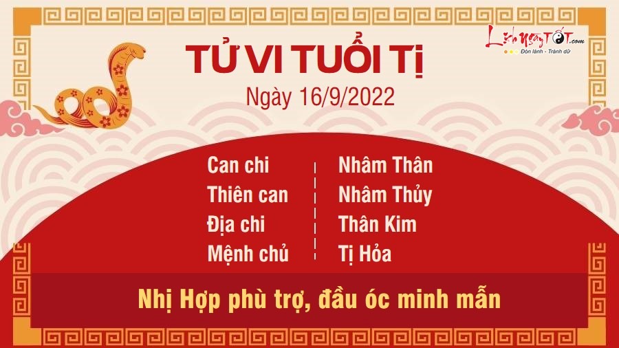 Nhị Hợp phù trợ, người tuổi Tị giữ được đầu óc minh mẫn và tỉnh táo, chính nhờ vậy công việc khó khăn cũng được giải quyết dễ dàng hơn. Thậm chí, bạn tìm ra hướng đi mới cho chính mình. Bạn được rất nhiều người yêu mến, và để đáp lại điều đó, bạn cũng nên cư xử nhiệt tình hơn với mọi người. Thỉnh thoảng hãy chủ động hỏi han mọi người, điều này sẽ có tác dụng lớn lao trong việc gắn kết các mối quan hệ đấy. Hỏa khắc Kim, tiếc rằng tình cảm của bạn với cha mẹ không được ổn định lắm trong ngày hôm nay. Có lẽ khoảng cách thế hệ khiến đôi bên vẫn chưa thực sự hiểu được suy nghĩ của đối phương. Đôi bên cần bình tĩnh trao đổi với nhau hơn.