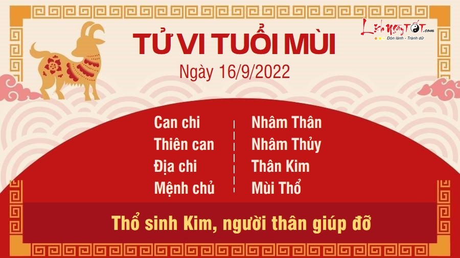 Thổ sinh Kim, tình cảm của người tuổi Mùi rất bình yên. Nếu có điều gì khiến bạn thấy băn khoăn, bạn có thể tâm sự với người ấy xem sao. Cho dù người ấy không giúp được gì cho bạn đi nữa thì ít nhất, bạn cũng sẽ thấy nhẹ nhõm hơn. Trong các mối quan hệ xã giao, bạn là người biết cư xử nên chẳng bao giờ làm mất lòng ai. Thậm chí, bạn còn là người gắn kết cả tập thể lại với nhau. Nhờ có tinh thần đoàn kết, công việc khó khăn đến mấy cũng trở nên đơn giản hơn hẳn. Hôm nay trực Bế là ngày xấu mọi việc trừ đắp đê, lấp hố, rãnh. Vì thế, bạn nên lên kế hoạch thực hiện cách công việc phù hợp. Nếu có việc trọng đại mà không quá gấp gáp, bạn có thể rời sang ngày khác để gặp nhiều thuận lợi hơn.