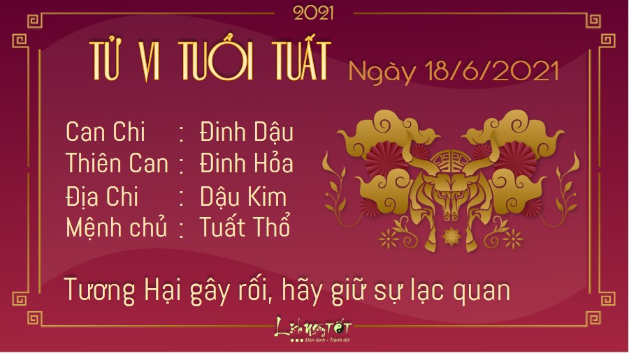 Tuổi Tuất phải đối diện với đủ chuyện phức tạp dưới ảnh hưởng của cục diện Tương Hại. Cách tốt nhất để vượt qua chuyện này chính là luôn luôn giữ những suy nghĩ lạc quan, tích cực. Trong chuyện tình cảm, mối quan hệ giữa bạn và nửa kia đang có dấu hiệu rạn nứt. Lúc này, bạn càng tỏ vẻ dửng dưng thì quan hệ giữa đôi bên lại càng trở nên xa cách. Bạn nên chủ động xuống nước với đối phương và nhanh chóng tìm cách hòa giải nếu muốn gìn giữ mối quan hệ này. Nếu hôm nay cần phải xuất hành đi xa, bạn nên đi theo những hướng tốt để gặt hái được nhiều may mắn và dễ dàng thành công hơn. Hướng xuất hành tốt hôm nay là Nam để gặp Hỷ thần và Đông để gặp Tài thần.