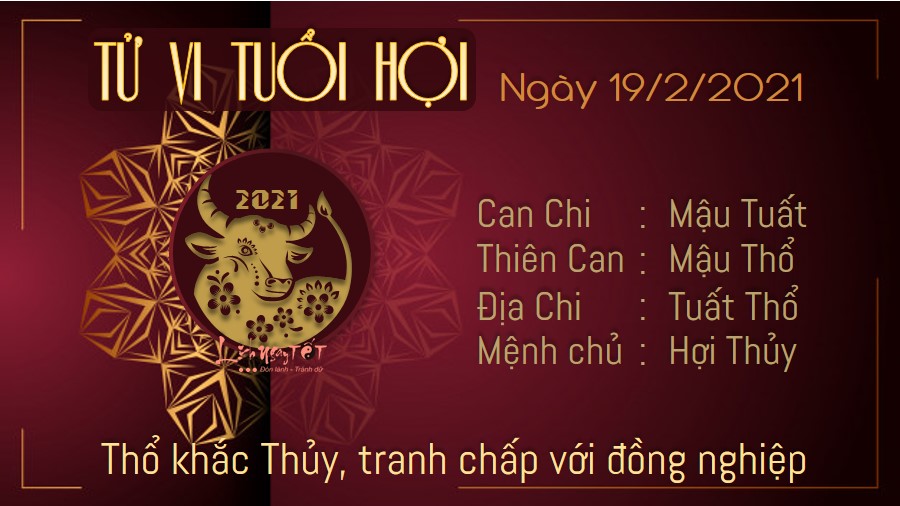Thổ khắc Thủy, các mối quan hệ xã hội của người tuổi Hợi không được thuận lợi trong ngày hôm nay. Những mâu thuẫn, bất đồng với bạn bè hoặc đồng nghiệp khiến mọi chuyện càng lúc càng trở nên căng thẳng hơn. Trong gia đình, bạn thích làm theo ý mình mà không để ý đến cảm nhận của người khác. Hãy biết đặt mình vào vị trí của người khác, đừng ích kỷ coi việc mọi người chiều theo ý mình là hiển nhiên. Trên phương diện tài lộc, Thiên Tài cho thấy bạn dễ phát tài bất ngờ nhờ các trò may rủi. Tuy nhiên, bạn không nên sống phụ thuộc vào số tiền này. Hãy cố gắng làm mọi việc dựa trên công sức của mình, dù bây giờ có vất vả nhưng sau này sẽ có hạnh phúc dài lâu.