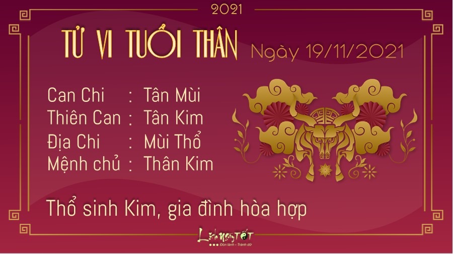 Thổ sinh Kim, người tuổi Thân được tận hưởng một ngày yên bình. Gia đình chính là nơi đem lại cho bạn cảm giác thoải mái và thư giãn nhất sau một ngày làm việc mệt mỏi. Đây cũng là nơi tiếp thêm cho bạn động lực để bắt đầu một ngày mới. Với người độc thân, bạn có thể trở thành tâm điểm của đám đông khi xuất hiên ở bất cứ đâu nhờ phong thái tự nhiên, vui vẻ của mình. Nếu nhận được lời mời làm quen của người khác, bạn có thể thử cho đối phương một cơ hội xem sao. Tiếc rằng trên phương diện sự nghiệp, Kiếp Tài cho thấy bạn thường khăng khăng làm theo ý mình chứ ít khi nghe theo lời khuyên nhủ của người khác. Đừng để thái độ cứng đầu cứng cổ đẩy bạn vào những rắc rối không đáng có.