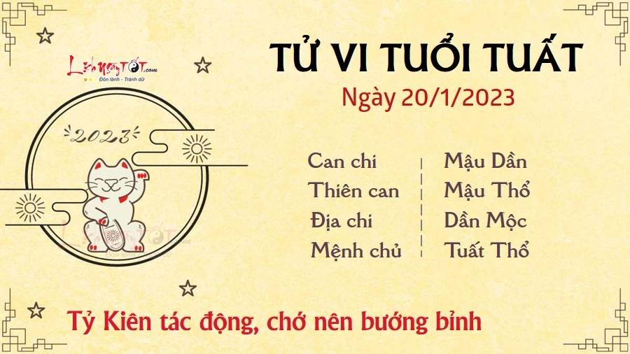 Tỷ Kiên tác động, người tuổi Tuất có thể trở nên quá bướng bỉnh trong ngày hôm nay. Bạn thích làm mọi việc theo ý mình, bỏ ngoài tai cảm xúc của mọi người xung quanh. Ngoài ra, bạn cũng cần hạn chế gây mâu thuẫn với người khác. Thời điểm giáp Tết như thế này, bớt được càng nhiều rắc rối thì càng tốt. Hãy khoan dung hơn, bạn sẽ nhận ra chẳng có việc gì mà mình không thể cho qua. Mộc khắc Thổ, người còn độc thân không nên vội vàng tin theo những lời đường mật của những người không quen biết, bởi đó có thể là kẻ đang muốn lợi dụng bạn đấy. Hãy dành thời gian để tìm hiểu kĩ hơn về đối phương.