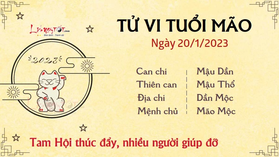 Nhờ Tam Hội thúc đẩy, người tuổi Mão có một ngày 29 Tết yên bình và vui vẻ. Bạn nhận được sự quan tâm, giúp đỡ của mọi người, đặc biệt là người nhà nên bắt tay vào thực hiện công việc gì cũng suôn sẻ, nhanh chóng. Quan hệ xã giao tốt đẹp cũng giúp cho người làm ăn kinh doanh gặp được một vài đối tượng khách hàng, đối tác triển vọng ngay trong ngày cuối năm. Đôi bên có thể suy tính đến việc hợp tác với nhau trong năm tới. Tuy nhiên, Mộc vượng khuyên bạn dù có bận rộn đến mấy, bạn cũng nên chú ý đến sức khỏe. Hãy có chế độ làm việc và nghỉ ngơi khoa học, đừng nên bắt cơ thể làm việc quá sức, đặc biệt nếu có dấu hiệu cảnh báo thì cần đi khám chữa ngay.