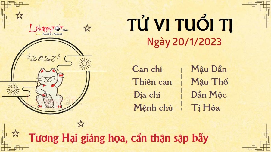 Người tuổi Tị phải chịu nhiều tác động xấu do cục diện Tương Hại mang lại. Nếu có việc ra ngoài trong ngày hôm nay, bạn chớ cả tin kẻo rơi vào cái bẫy kẻ xấu đặt sẵn, đẩy bản thân vào cảnh tốn tài hao của. Người làm ăn buôn bán cũng cần cẩn thận trong việc đưa ra các quyết định. Dù sao cũng đã là những ngày cận kề cuối năm, bạn không nên vội vàng triển khai những dự án mới mà hãy hoàn thành nốt những nhiệm vụ còn dang dở của mình. Nếu có ý định đi xa trong ngày hôm nay thì bản mệnh nên đi về hướng Đông Nam để gặp Hỷ Thần hoặc hướng Bắc để gặp Tài Thần. Đây là hai hướng sẽ mang lại nhiều may mắn, giúp công việc của bạn thêm phần thuận lợi.