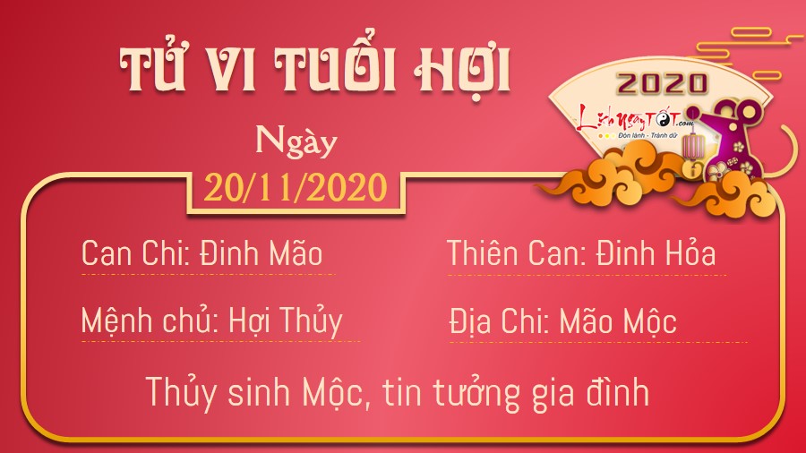 Thủy sinh Mộc, người tuổi Hợi đã lập gia đình sẽ có một ngày khá yên bình. Nếu có vấn đề gì xảy ra, các thành viên trong nhà sẽ luôn trao đổi với nhau để tìm cách giải quyết hợp lý nhất. Những người còn độc thân có thể nhận được tín hiệu đáng mừng từ những người khác giới. Con người không có ai hoàn hảo, bạn chớ nên "kén cá chọn canh", hãy có cái nhìn tích cực hơn để nhận ra được những ưu điểm của người khác. Chính Quan nâng đỡ giúp sự nghiệp của bạn đạt được những bước tiến triển khả quan. Hãy giữ tinh thần làm việc nghiêm túc, trách nhiệm, có mục tiêu hướng tới rõ ràng, bạn sẽ được lãnh đạo đánh giá cao và trọng dụng.
