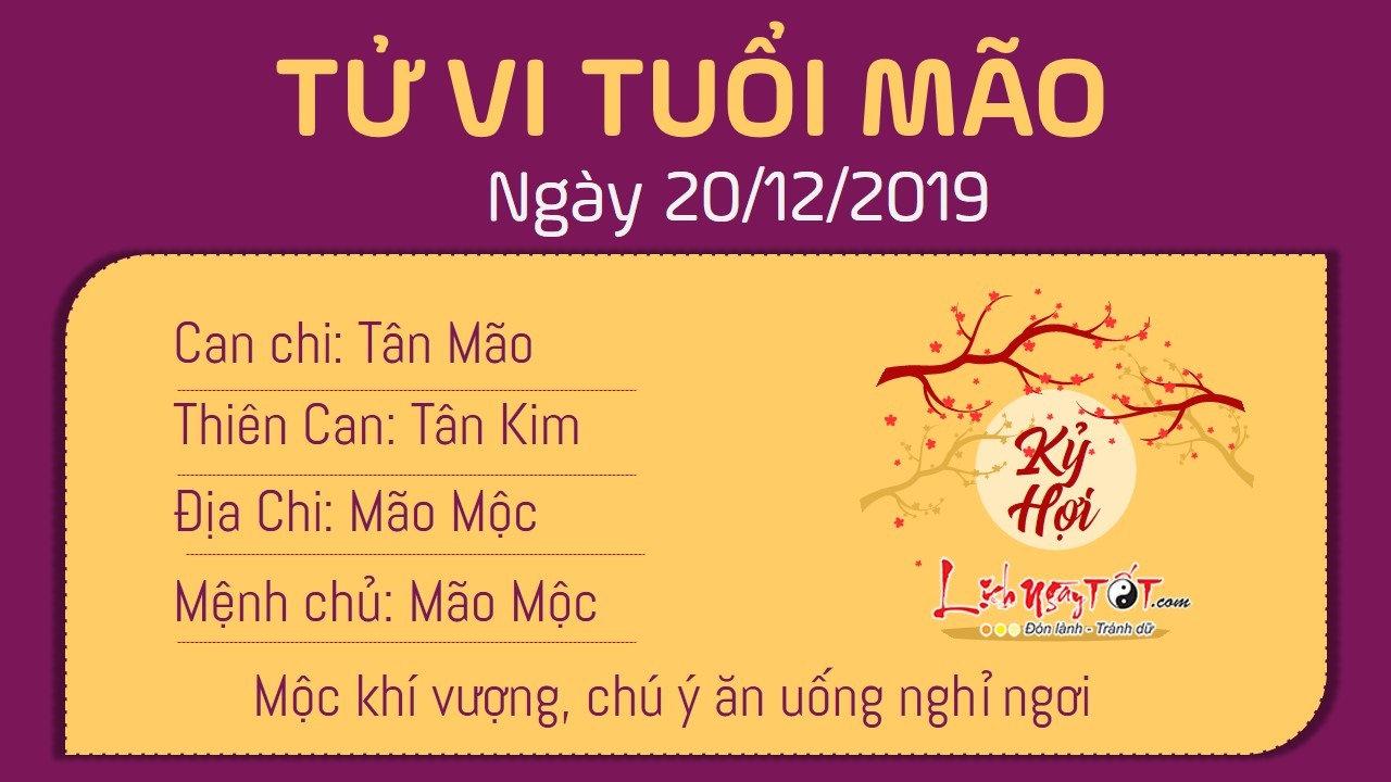 Mộc khí vượng, ảnh hưởng khá lớn đến sức khỏe của người tuổi Mão, đặc biệt các bệnh liên quan đến gan. Bản mệnh nên chú ý hơn đến vấn đề ăn uống và nghỉ ngơi, bởi chính thói quen sinh hoạt hàng ngày có thể gây cho chúng ta nhiều căn bệnh không thể lường trước được. Tuổi Mão được Thiên Tài trợ mệnh nên đường tài lộc khởi sắc rõ rệt. Chuyện làm ăn buôn bán suôn sẻ vô cùng, đi đâu cũng gặp người tốt giúp đỡ. Trong ngày hôm nay, bản mệnh còn có khả năng kí kết được những hợp đồng làm ăn mới, dự báo sẽ đem lại lợi nhuận lớn trong tương lai, đủ để tiến hành mở rộng quy mô kinh doanh. Người làm công ăn lương có cơ hội nhận được một khoản tiền thưởng bất ngờ.