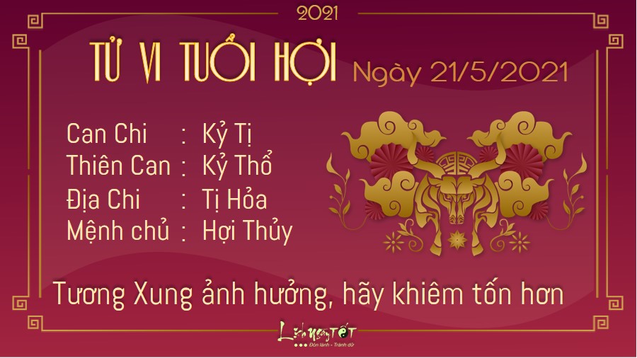 Dưới tác động xấu của Tương Xung, tuổi Hợi thích thể hiện quan điểm nhưng lại không ý thức được hoàn cảnh và đối tượng giao tiếp với mình. Đừng nên "múa rìu qua mắt thợ" và tự đẩy mình vào tình huống khó xử. Người trẻ tuổi dù có tham vọng muốn chứng minh bản thân thì trước hết, bạn vẫn cần phải có một khoảng thời gian dài cố gắng chứ không nên đốt cháy giai đoạn vì muốn thấy ngay kết quả. Hãy lập cho mình một kế hoạch với đích đến cụ thể và cố gắng không ngừng. Thủy khắc Hỏa, bạn và nửa kia chẳng được như ý trong ngày hôm nay. Bạn cảm thấy bất mãn vì nửa kia không hiểu được ý muốn của mình, nhưng vấn đề có thể nằm ở việc bạn chưa truyền đạt mong muốn một cách rõ ràng.