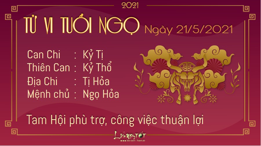 Công việc của người tuổi Ngọ tiến triển vô cùng thuận lợi nhờ có Tam Hội nâng đỡ. Bạn chỉ cần hết mình vì công việc thì sẽ đạt được mục tiêu đã đề ra, thậm chí thành quả mà bạn gặt hái được còn vượt xa mong đợi. Các mối quan hệ xã giao của con giáp này phát triển hài hòa. Càng may mắn hơn, bạn có cơ hội gặp được quý nhân vào chính ngày hôm nay. Quý nhân sẽ là người chỉ ra cho bạn những con đường phù hợp trong tương lai. Nếu có việc cần phải xuất hành trong ngày hôm nay, bản mệnh nên đi về hướng Đông Bắc để gặp Hỷ thần hoặc Nam để gặp Tài Thần. Hai hướng đi này sẽ giúp công việc của bạn gặp nhiều điều thuận lợi hơn.
