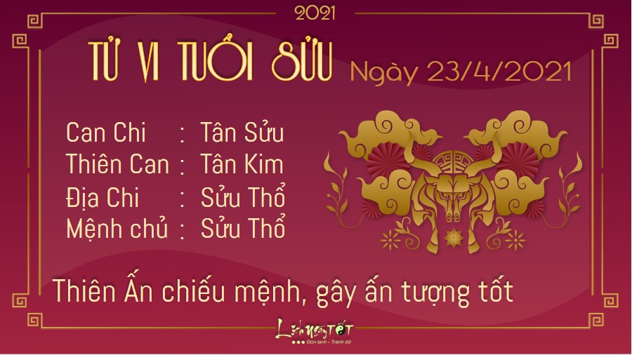 Thiên Ấn chiếu mệnh, người tuổi Sửu có thể gây ấn tượng tốt đẹp với mọi người xung quanh nhờ cách xử trí vấn đề thông minh của mình. Bạn luôn là người đầu tiên đưa ra cách giải quyết các vấn đề hóc búa, giúp tập thể vượt qua khó khăn. Người làm ở vị trí cao có thể thể hiện được khả năng lãnh đạo của mình, từ đó nhận được sự kính trọng và khâm phục của cấp dưới. Trong tương lai, bạn sẽ là người chỉ đường dẫn lối, dẫn dắt mọi người tiến xa hơn nữa. Thổ khắc Thủy cho thấy con giáp này cần phải dành thời gian để trò chuyện với nửa kia của mình nhiều hơn. Đừng quá bận rộn với công việc mà lờ đi cảm xúc và suy nghĩ của người ấy, cũng như không quan tâm đến các công việc nhà.