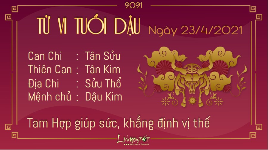 Người tuổi Dậu dễ dàng khẳng định được khả năng và nhận được sự thán phục của mọi người xung quanh nhờ vốn hiểu biết phong phú. Thêm vào sự giúp đỡ của Tam Hợp, bạn hoàn toàn có thể khẳng định được vị thế của mình. Có điều con giáp này cũng không nên quá hiếu thắng trong mọi vấn đề. Trước khi giải quyết việc gì, bạn nên suy tính trước sau kĩ càng, đánh giá đúng năng lực bản thân cũng như tình hình thực tế trước mắt. Thổ sinh Kim, chuyện tình cảm của con giáp này phát triển tốt đẹp và ổn định. Bạn và người ấy ngày càng trở nên thấu hiểu nhau hơn. Nếu còn chưa kết hôn, hai bạn đã có thể bắt đầu suy nghĩ nghiêm túc về vấn đề này.