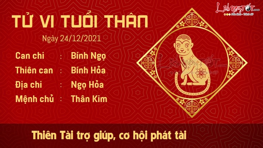 Thiên Tài trợ giúp, người tuổi Thân có cơ hội phát tài trong ngày hôm nay nhờ dựa vào may mắn của chính mình. Bản mệnh nên có cách sử dụng đồng tiền ấy hợp lý, đừng nên đổ vào những chuyện mua sắm hoặc vui chơi hưởng thụ. Người chăm chỉ với các công việc làm thêm cũng sẽ được nhận một khoản tiền lương, tiền thưởng tương xứng với công sức lao động. Bạn có thể coi đây là động lực để tiếp tục cống hiến trong tương lai, nhưng đừng làm việc quá sức nhé. Hỏa khắc Kim, đáng tiếc là quan hệ giữa bạn và nửa kia không được hài hòa. Bạn không nên vội vàng kết tội người ấy chỉ vì nghe thấy những lời đồn thổi của người khác. Hãy lắng nghe người ấy giải thích trước khi phán xét nhé, có thể bạn chỉ đang hiểu lầm thôi.