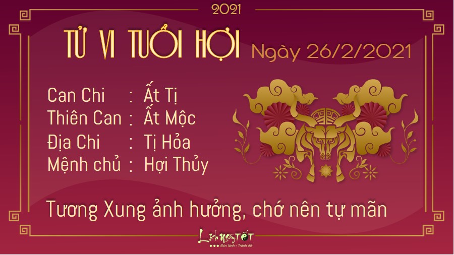 Tác động xấu của Tương Xung, người tuổi Hợi thích thể hiện quan điểm của bản thân mình nhưng lại không ý thức được hoàn cảnh và đối tượng giao tiếp với mình. Bạn có thể tự đẩy mình vào tình huống khó xử nếu cứ tiếp tục “múa rìu qua mắt thợ” như thế này. Người trẻ tuổi dù có tham vọng muốn chứng minh bản thân thì trước hết, bạn vẫn cần phải có một khoảng thời gian dài cố gắng chứ không nên vội vàng và nôn nóng. Thủy khắc Hỏa, bạn và nửa kia chẳng được như ý trong ngày hôm nay. Bạn cảm thấy bất mãn vì nửa kia không hiểu được ý muốn của mình, nhưng vấn đề có thể nằm ở việc bạn chưa truyền đạt mong muốn thật rõ ràng. Hãy thử trò chuyện lại với người ấy xem sao.