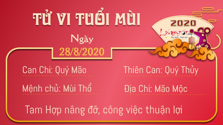 Tam Hợp là dấu hiệu tốt chứng tỏ công việc của người tuổi Mùi tiến triển thuận lợi. Tuy nhiên, nếu đánh giá năng lực bản thân và tình hình thực tế không chính xác thì bạn sẽ đưa ra những kế hoạch quá xa rời hiện thực, thậm chí là ảo tưởng đấy. Rất may mắn, bạn có cơ hội gặp gỡ quý nhân ngay trong ngày hôm nay. Đó sẽ là người chỉ ra con đường tương lai thích hợp cho bạn. Hãy tích cực nắm bắt cơ hội, đi theo con đường phù hợp nhất với mình. Tuy nhiên, Mộc khắc Thổ, con giáp này dành quá nhiều thời gian cho công việc xã hội nên thường quên mất công việc gia đình. Đừng tìm cớ đẩy mọi trách nhiệm cho người ấy, bởi xây dựng mái ấm không phải là trách nhiệm của riêng ai.