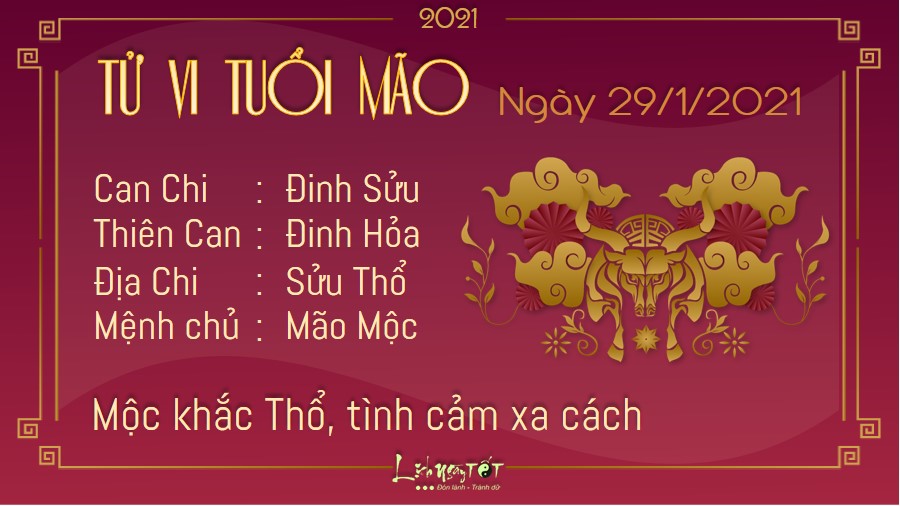 Mộc khắc Thổ cho thấy mối quan hệ giữa người tuổi Mão và con cái đang ngày càng trở nên căng thẳng và xa cách. Bạn có thể sẽ cảm thấy không hài lòng vì con cái bướng bỉnh, nghe lời. Tuy nhiên, bạn cần dành thời gian để tìm hiểu ngọn ngành vấn đề này đã. Bên cạnh đó, bạn và người ấy cũng có thể tranh cãi vì những ý kiến bất đồng. Nếu cứ một mực giữ suy nghĩ của mình, không chịu đặt mình vào vị trí của đối phương thì hai người sẽ nhanh chóng rơi vào bế tắc. Hai người đều cần phải biết lắng nghe hơn. Hôm nay là ngày 17 âm lịch, nhân thần ở phía trong khớp cổ chân, khí xung và xương bánh chè. Tránh mọi sự tổn thương, va chạm, mổ xẻ, châm chích tại vị trí này.
