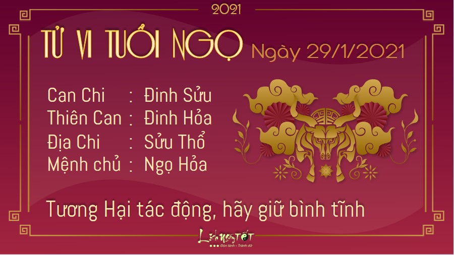 Tuổi Ngọ vốn tài giỏi và nhanh trí, nhưng dưới tác động của cục diện Tương Hại, bạn lại không thể giữ được sự điềm tĩnh của mình. Thậm chí, bản mệnh sẵn sàng tranh cãi hoặc gây gổ với những ai nêu ý kiến trái ngược. Đây cũng là lý do khiến bạn dễ dàng mất kiên nhẫn nếu phải giải quyết những công việc khó khăn, cần sự tỉ mỉ. Bạn cần phải chấn chỉnh lại tinh thần cho mình, chớ nên bỏ dở mọi việc giữa chừng, nếu không dù tài giỏi đến mấy bạn cũng không thể thành công. Hỏa sinh Thổ, bạn luôn dành sự quan tâm và tôn trọng đến những thành viên lớn tuổi trong gia đình mình nên cũng được mọi người yêu mến và chiếu cố. Hôm nay, bạn cũng có thể được họ giới thiệu cho những cơ hội đáng quý.