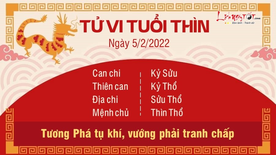 Ngày Sửu Thìn Tương Phá, người tuổi Thìn dễ vướng phải tranh chấp giữa anh em, người thân trong gia đình. Ngày Tết kiêng kị việc mâu thuẫn, cãi vã, vì vậy, bạn nên bao dung và rộng lượng với mọi người hơn. Mọi thứ hãy chín bỏ làm mười, không nên để chuyện bé xé ra to. Ngày này còn có Kiếp Tài án ngữ trong vận trình khiến tài lộc của những chú Rồng rất dễ bị hao tổn. Bạn nên suy tính thận trọng trước khi định chi tiêu món tiền lớn. Đặc biệt, hôm nay Thìn nên tránh xa các trò đỏ đen bài bạc nhé, vận may không đứng về phía bạn nên dễ thua lỗ lắm đấy. Thổ khí vượng còn là lời cảnh báo về những bất thường của sức khỏe tuổi Thìn. Con giáp này dễ cảm thấy chán nản trong chuyện ăn uống, không thấy ngon miệng, thậm chí có thể bị đau dạ dày nữa.